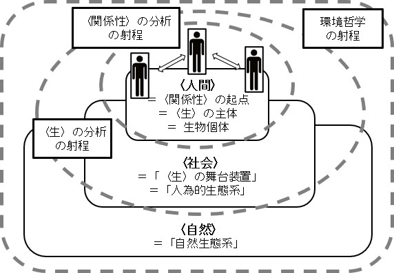 本書では〈自己完結社会〉の成立という問題を受けて、そもそも「人間とは何か」という根源的な問いにまで遡っていくことになる。つまり人間とはいかなる存在であり、われわれはその存在をいかなる形で記述することができるのか、ということについて問うことになるのである。そしてそのために用いられるのが、「環境哲学」、「〈生〉の分析」、「〈関係性〉の分析」という、三つのアプローチなのであった。